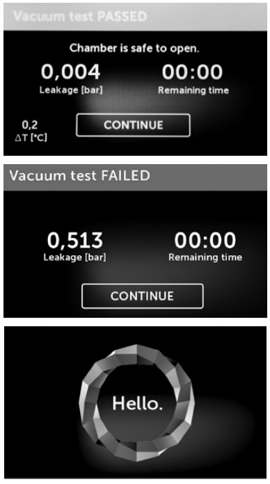 enbio s vacuum test fail:pass screen This graphic shows the different screens that can display based on whether the vacuum test completes successfully or fails, along with the default start screen on the Enbio S autoclave.